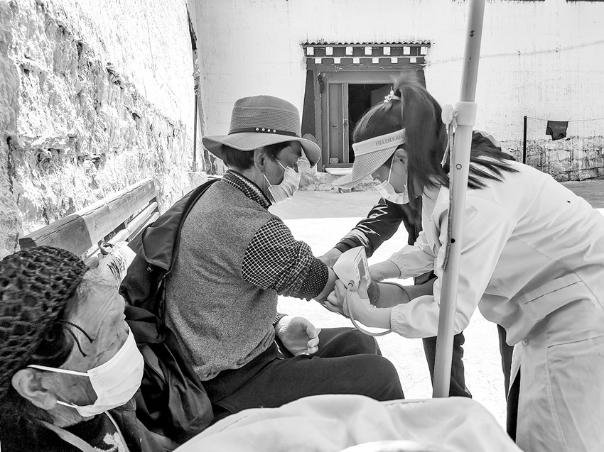圖為入戶開(kāi)展腫瘤防治宣傳時(shí)醫(yī)護(hù)人員提供免費(fèi)量血壓服務(wù)。
