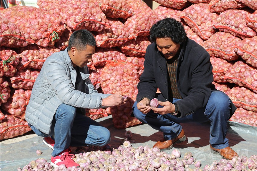為保證裝袋大蒜質(zhì)量,村民們分工對晾曬后的大蒜進行分揀,壞的和不合格的堅決不要,裝袋后由村支部進行復(fù)檢,確定每袋大蒜符合出售要求后再進行裝車?!拔曳N了4畝大蒜,今年收成很好,平均畝產(chǎn)達500斤以上,如果行情好的話,明年我還準(zhǔn)備增加種植面積。”村民貢嘎滿懷喜悅地說。看著裝滿大家“心血”的拖拉機漸行漸遠,村民們不時你一言我一語地討論著今年的收成,臉上滿是止不住的喜悅。